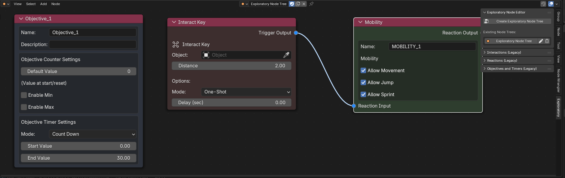 Create objectives, and string together 'Trigger' nodes and 'Reaction' nodes. Create as many node graphs as you need. Modify Blender properties, character abilities, objectives and more all within the node graph!