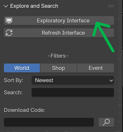 Exploring. To explore a world you must use Blender. For the best browsing experience, use the web app. If you choose to browse on the website, click any post then copy and paste the 'Download Code' to explore it in Blender. Every 'World' and 'Event' item has a download code that can be copied into Blender at any time. Shop items do not have a download code and can only be accessed via purchase.