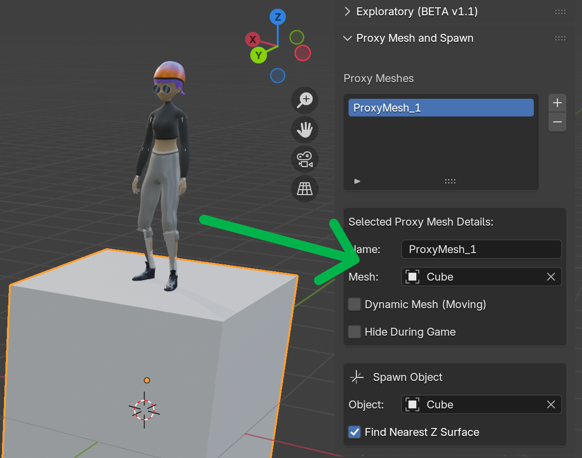 To add any mesh that the character should interact with we must first mark it as a "proxy mesh" as seen in the image. To identify where the character should spawn we must identify what object. This can be an empty object or a mesh. Once you have both of those you're good to start playing!!